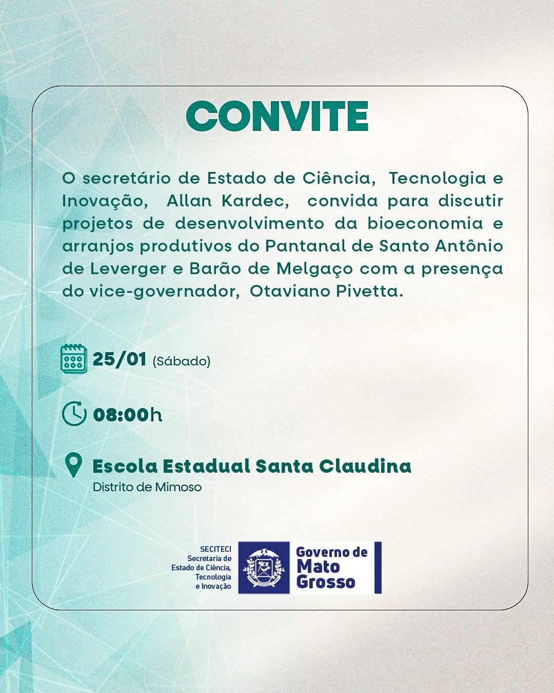 O governo do Estado de Mato Grosso, através da Secretaria de Estado de Ciência, Tecnologia e Inovação (Seciteci), realizará importante reunião para discutir projetos de desenvolvimento da bioeconomia e arranjos produtivos do Pantanal de Santo Antônio de Leverger e Barão de Melgaço. O evento ocorre no sábado (25.01) na Escola Estadual Santa Claudina, distrito de Mimoso, a partir das 8h00, e contará com a presença do vice-governador Otaviano Pivetta.