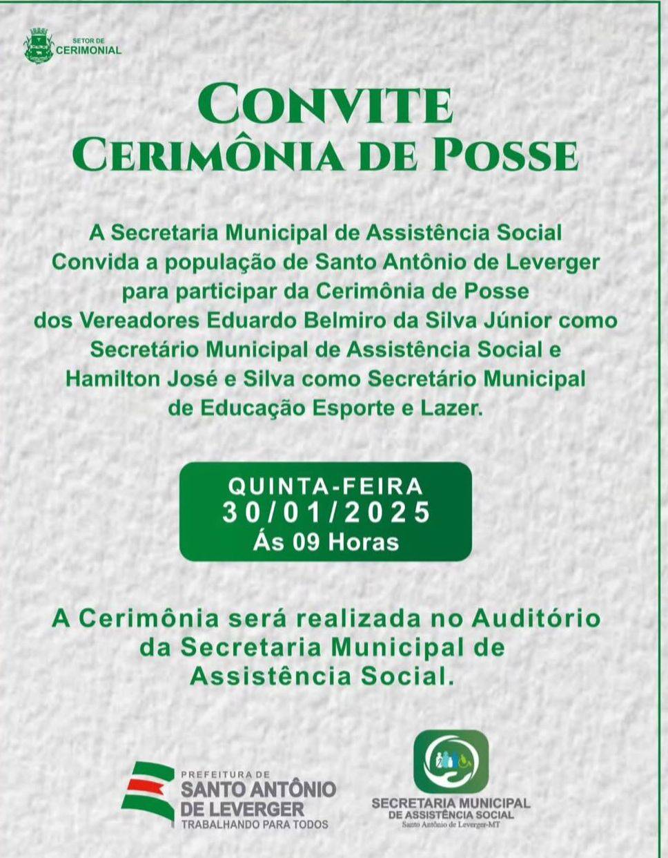 A cerimônia de posse ocorrerá às 9h desta quinta-feira, no salão de eventos da Secretaria Municipal de Assistência Social, no centro de Leverger. O evento deverá contar com a presença de autoridades, servidores e membros da comunidade, marcando o início de uma nova fase na administração municipal.