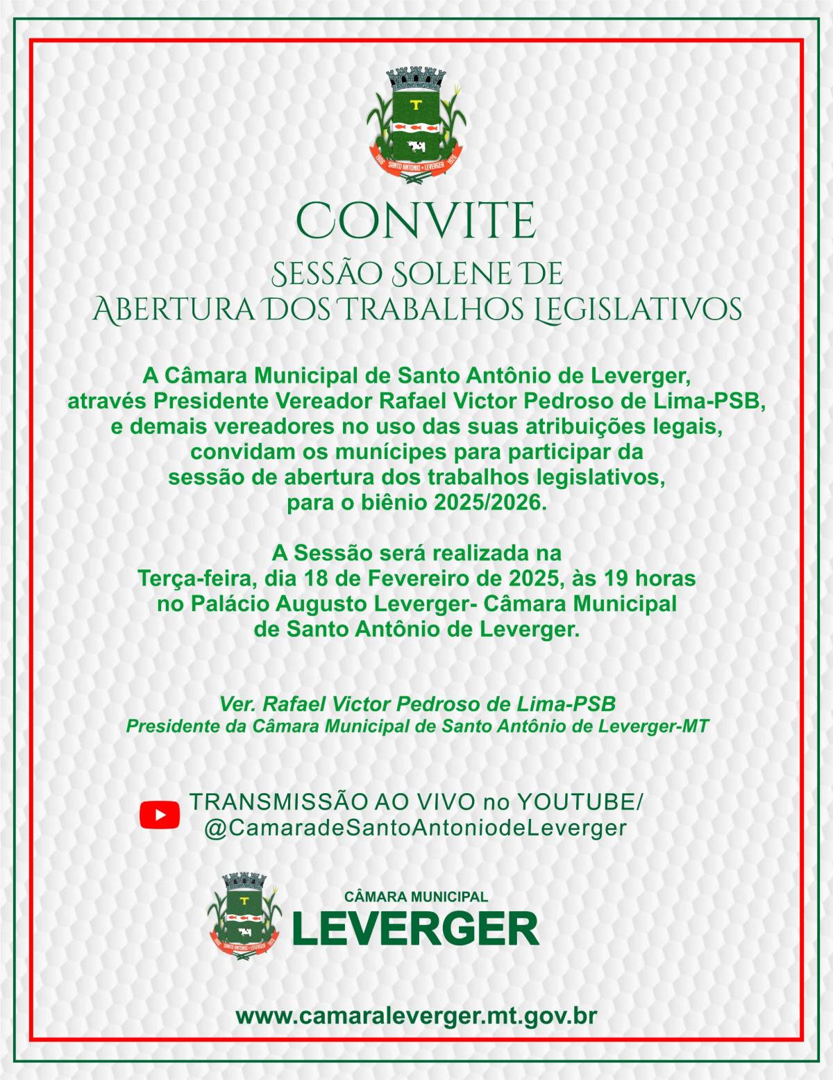 O presidente da Câmara de Santo Antônio de Leverger Rafael Lima (PSB) realiza nesta terça-feira (18/2), às 19 horas, a sessão solene de abertura do ano legislativo. A prefeita Francieli Magalhães (PSB) participará da sessão.