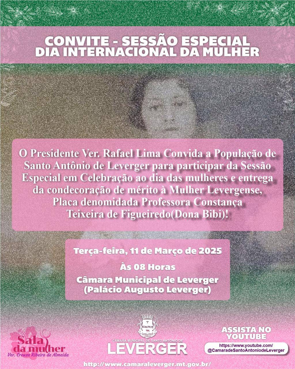 O presidente da Câmara Municipal de Santo Antônio de Leverger Rafael Lima (PSB) informa que será feita uma Sessão Solene na terça-feira (11/3), às 8 horas, para homenagear o Dia Internacional das Mulheres.