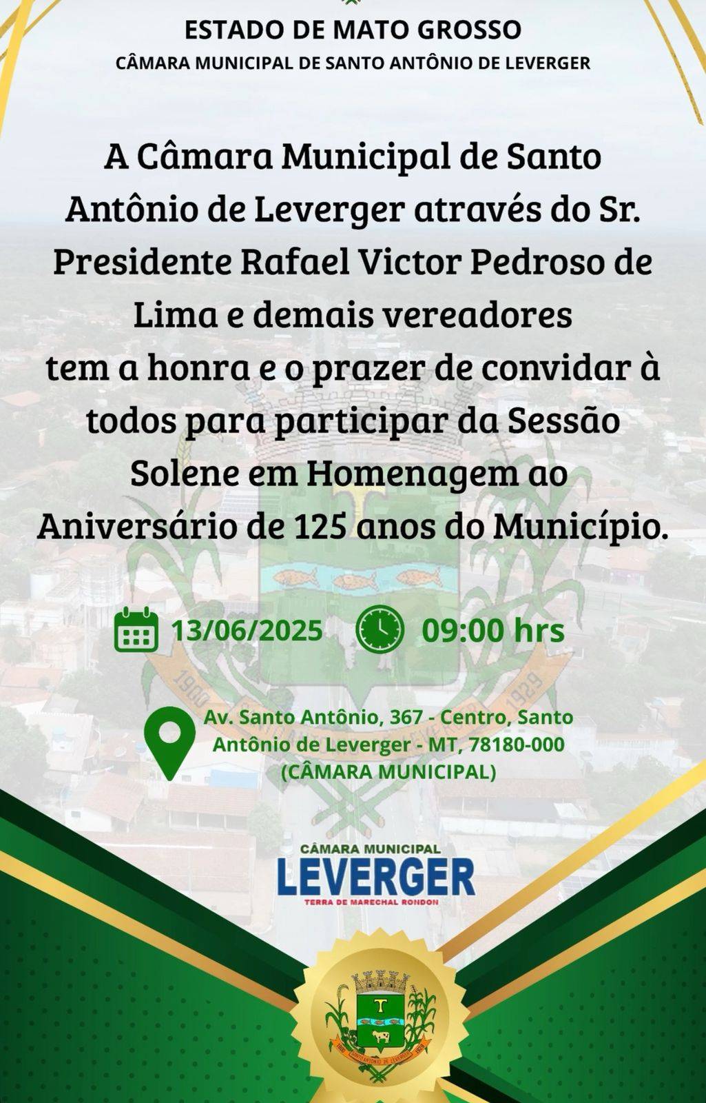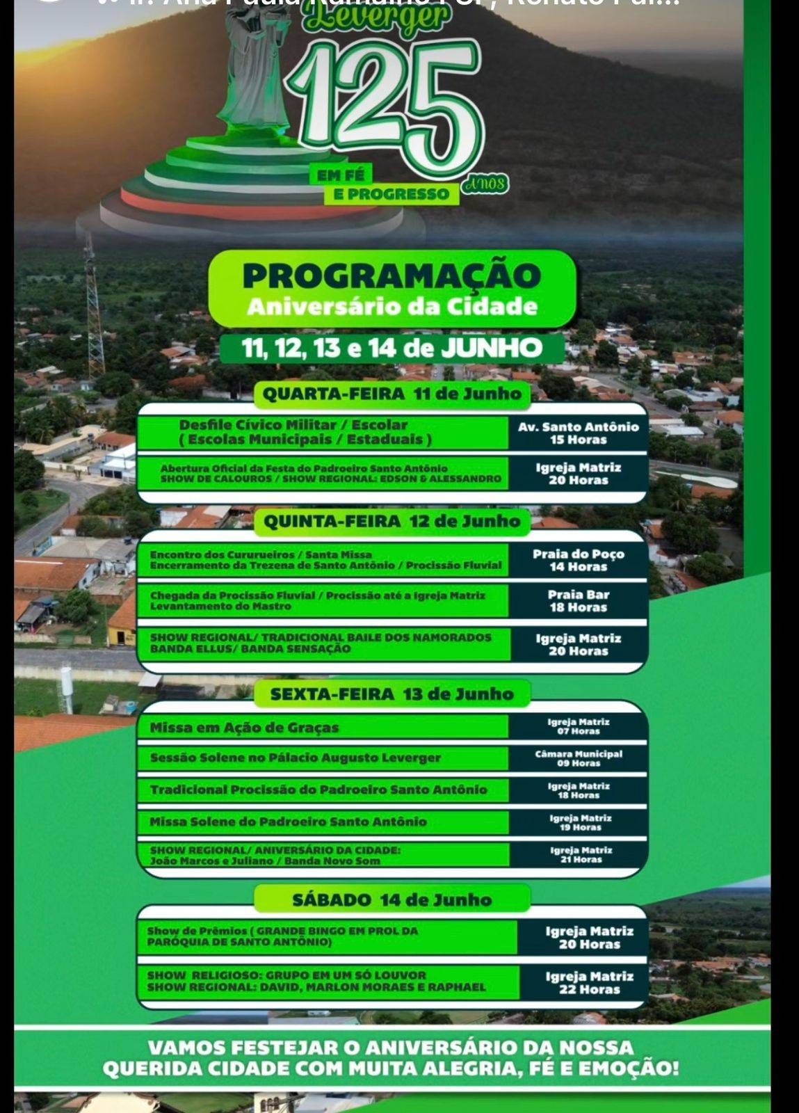 Até sábado, dia 14, a gestão da prefeita Francieli Magalhães, a administração da Câmara Municipal Rafael Lima (PSB) e a Paróquia de Santo Antônio de Leverger celebram os 125 anos do aniversário da cidade e do padroeiro Santo Antônio, comemorado dia 13 de junho.