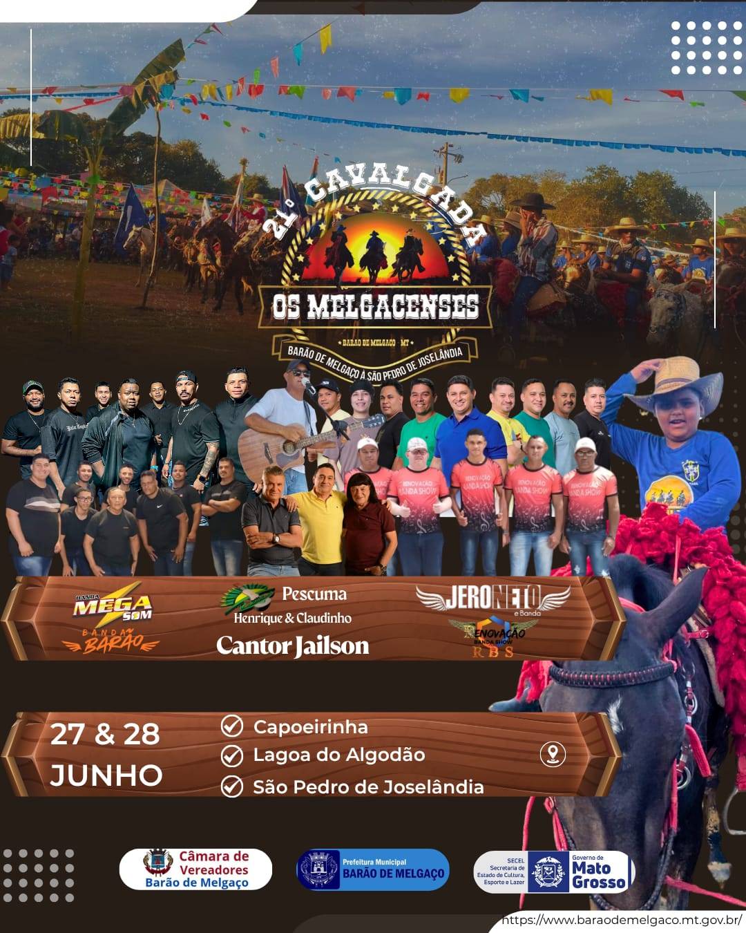 A tradicional 21a Cavalgada Os Melgacenses é o grande e esperado evento cultural e histórico de Barão de Melgaço neste fim de semana, sábado e domingo, dias 27 e 28 de junho. A cidade está há 114 Km ao Sul da capital Cuiabá.