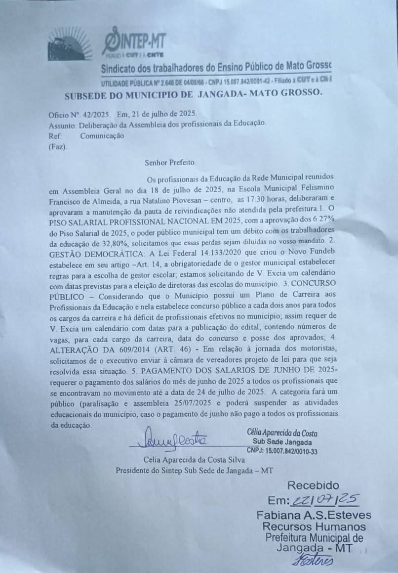 A subsede do Sindicato dos Trabalhadores no Ensino Público de Mato Grosso (Sintep-MT) em Jangada, convoca assembleia geral nesta sexta-feira, 25/07. O principal motivo é a falta de pagamento dos salários dos educadores, desde o final do mês de maio.
