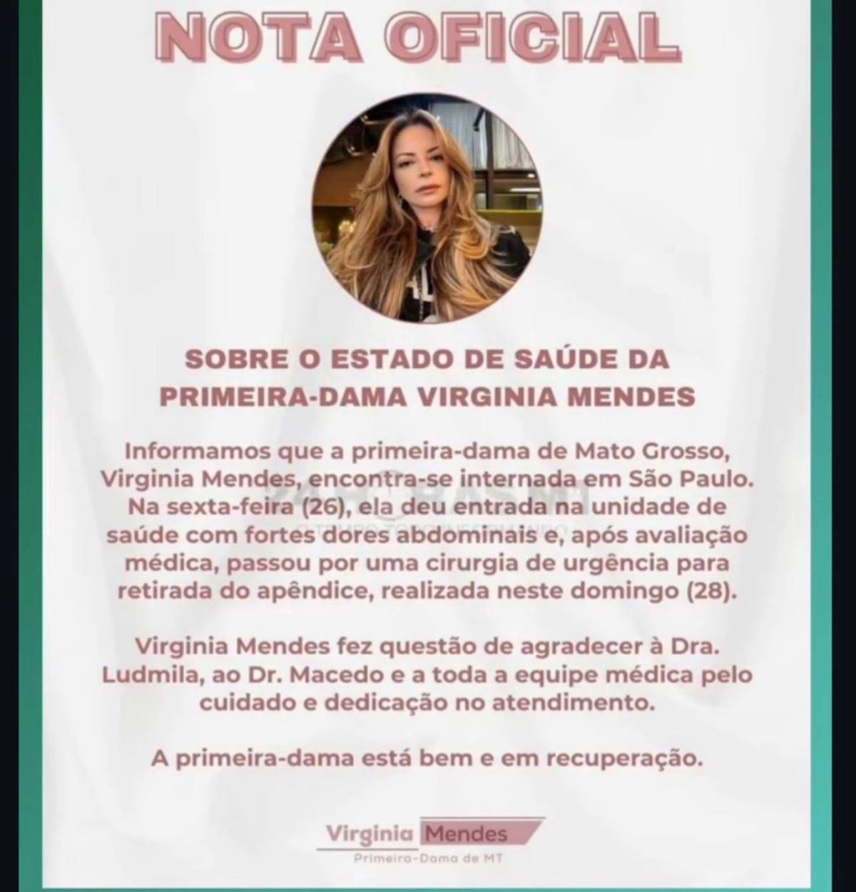 A primeira-dama de Mato Grosso, Virginia Mendes, foi internada em um hospital de São Paulo e passou por uma cirurgia de urgência para retirada do apêndice.