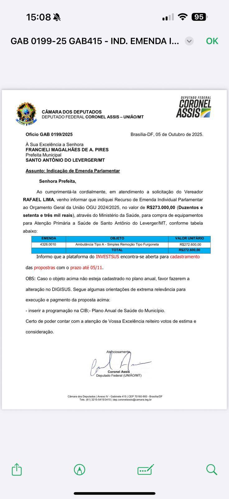 O deputado federal Coronel Assis (União) apresentou emenda parlamentar para contemplar o município de Santo Antônio de Leverger com uma ambulância do tipo A Furgoneta. O automóvel vai atender a saúde pública e melhorar a condição dos serviços prestados à população.