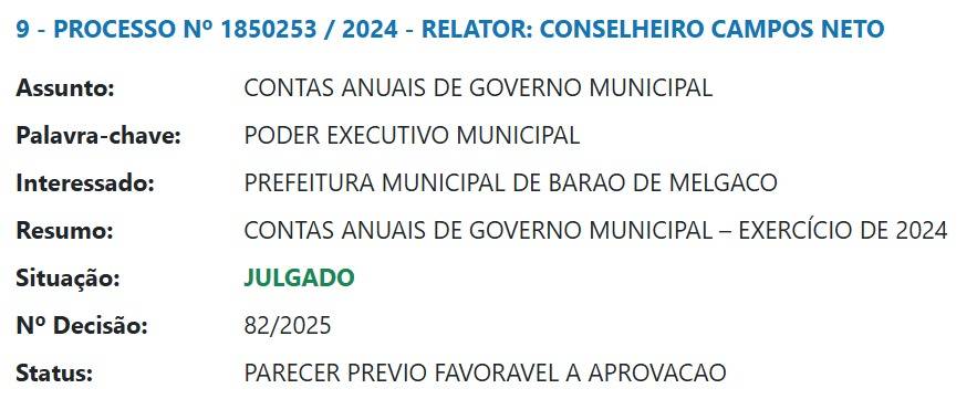 Em sessão ordinária realizada nesta terça-feira, 04 de novembro de 2025, o Tribunal de Contas do Estado de Mato Grosso (TCE/MT) emitiu parecer prévio favorável à aprovação das contas de governo do Município de Barão de Melgaço. A decisão abrange a prestação de contas referente ao exercício financeiro de 2024, da administração da prefeita reeleita, Margareth Gonçalves, submetida ao crivo dos auditores da Corte de Contas.