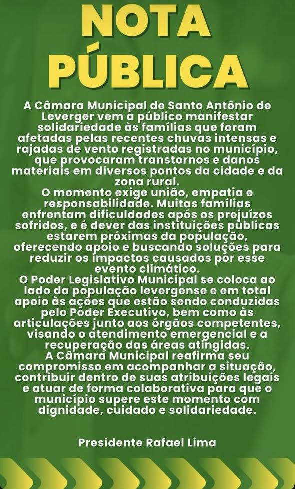 A Câmara Municipal de Santo Antônio de Leverger manifestou nota de solidariedade e apoio a todas as famílias atingidas pelas fortes chuvas e ventos registrados no município neste domingo. Diante dos prejuízos e transtornos, os vereadores prometem adotar as medidas institucionais para minimizar os impactos.