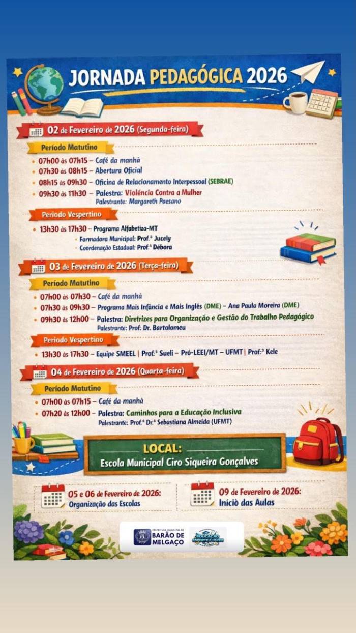 A Jornada Pedagógica reúne profissionais da educação com o objetivo de alinhar estratégias, metas e práticas pedagógicas que serão adotadas ao longo do ano. A iniciativa ocorre no município de Barão de Melgaço e integra o calendário educacional da Secretaria Municipal de Educação, com atividades voltadas à organização do trabalho escolar e ao planejamento das ações didáticas.