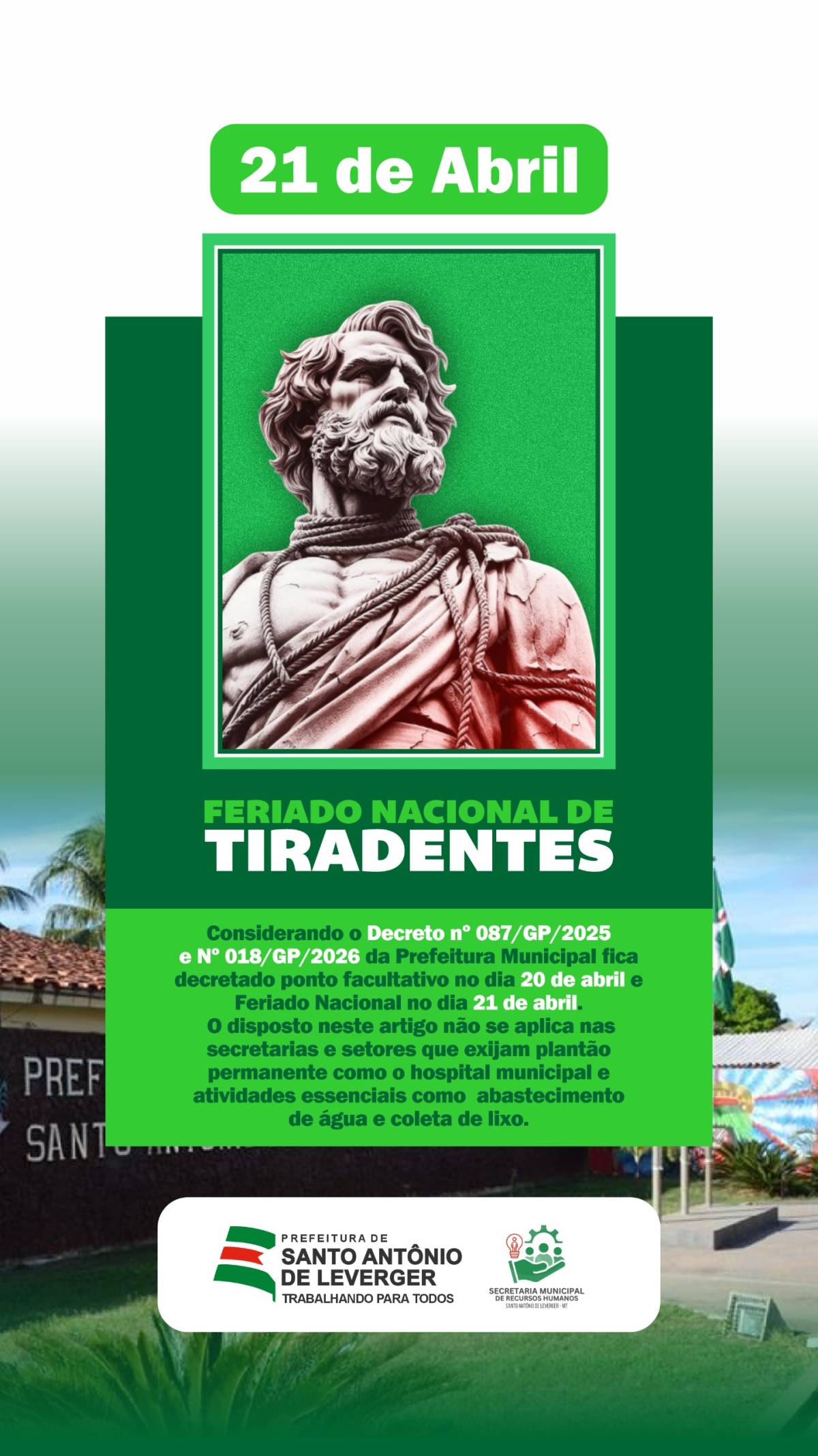 A prefeita de Santo Antônio de Leverger, Francieli Magalhães, decretou ponto facultativo nos órgãos da Administração Pública Municipal na próxima segunda-feira, dia 20 de abril de 2026. A medida foi publicada com base nas atribuições legais previstas na Lei Orgânica do Município e considera o feriado nacional de Tiradentes, celebrado no dia 21 de abril.