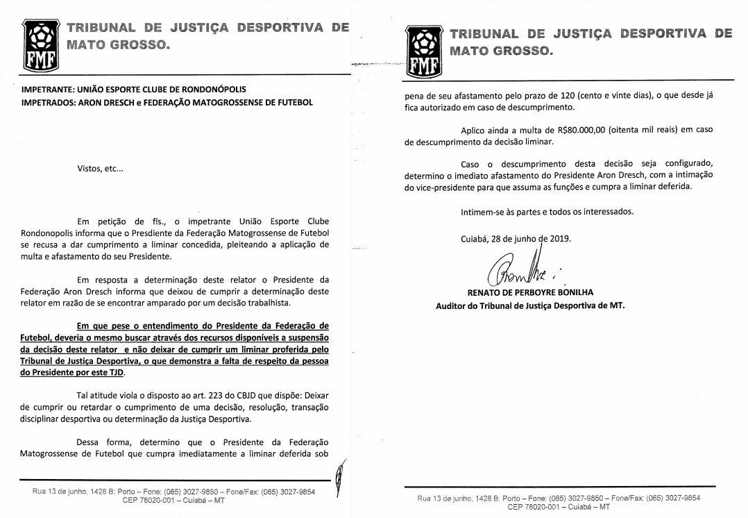 Ele também foi multado em R$ 80 mil. A decisão foi proferida em recurso do União Esporte Clube, de Rondonópolis, contra Dresch e a FMF. Ao invés de descumprir, na visão do presidente do TJD, ele deveria recorrer e não simplesmente alegar que “se encontrava amparado por uma decisão trabalhista que determinava o bloqueio de qualquer tipo de receita junto a patrocinadores e à FMF”.