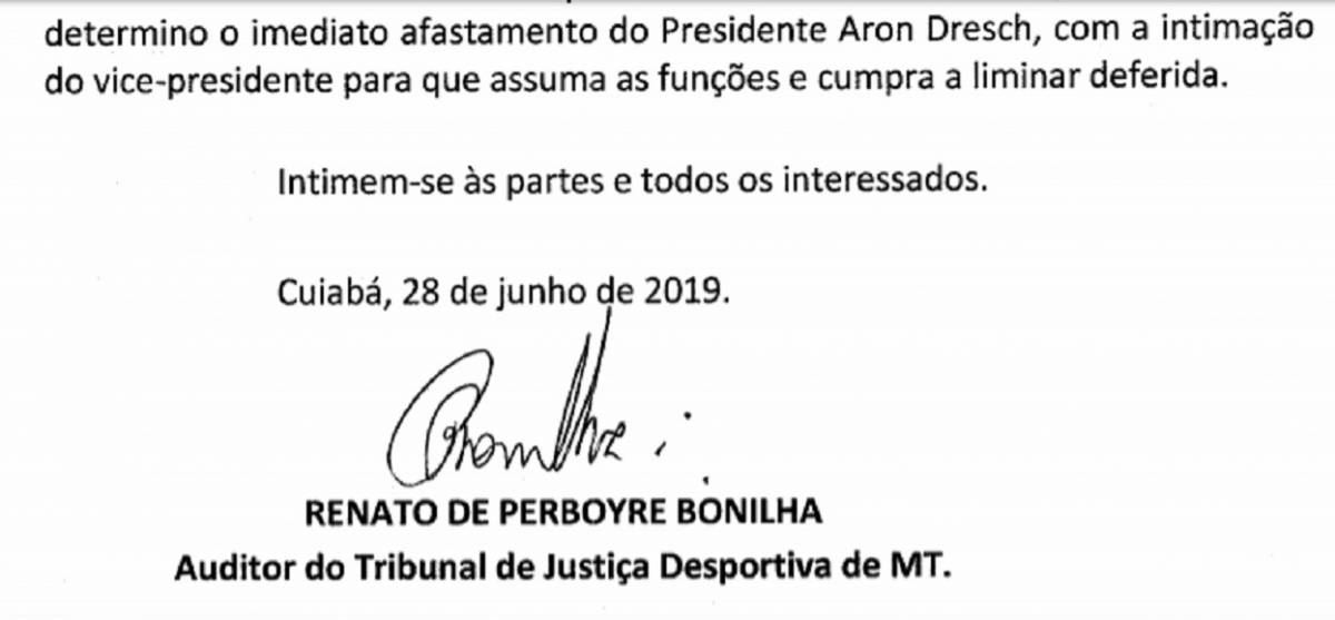 O presidente da Federação Mato-Grossense de Futebol (FMT), empresário Aron Dresch, foi afastado automaticamente, na noite desta sexta-feira (28), do comando da entidade por 120 dias, conforme determinação do auditor do Tribunal de Justiça Desportiva (TJD), Renato de Perboyre Bonilha, em decorrência de descumprimento de decisão liminar.