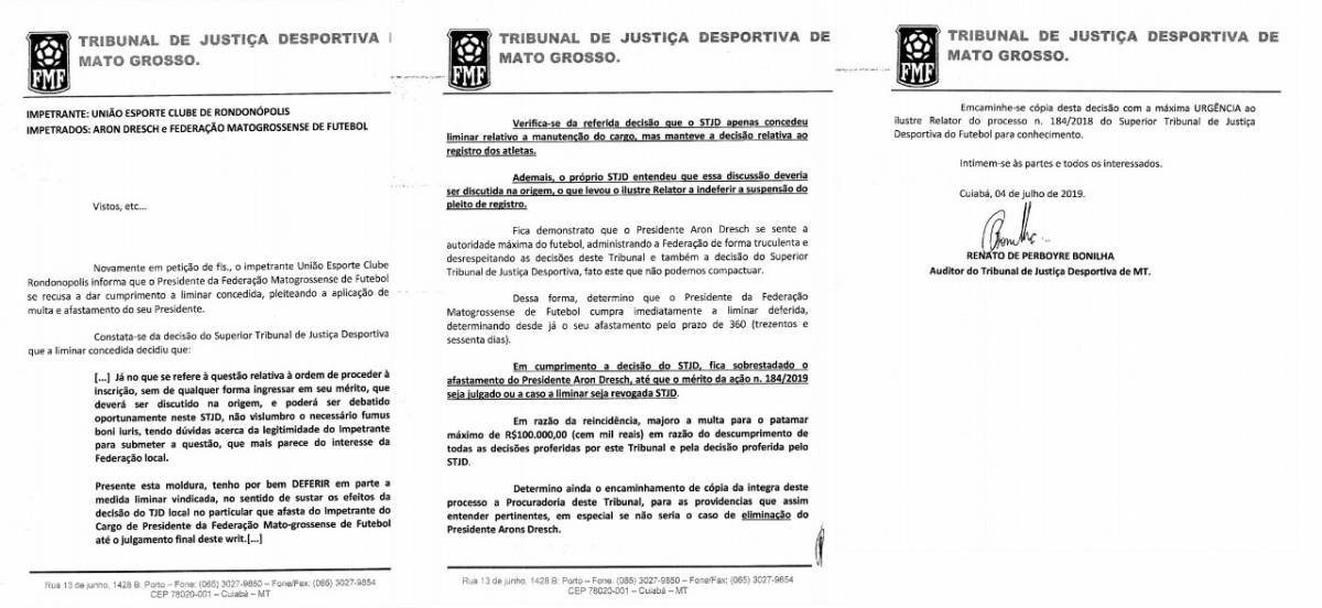 Embora o presidente da Federação Mato-grossense de Futebol (FMF) Aron Dresch tenha recebido uma liminar favorável do Superior Tribunal de Justiça Desportiva (STJD) para sua permanência no cargo – sob efeito liminar -, respaldado por uma ordem do Tribunal Regional do Trabalho, o Tribunal de Justiça Desportiva (TJD-MT) emitiu nova decisão, nesta sexta-feira, ampliando para 360 dias o afastamento do dirigente da entidade e aumentando para R$ 100 mil o valor da multa pelo não cumprimento da determinação publicada na última sexta-feira (28), que era de autorizar a inscrição de novos jogadores do União de Rondonópolis.
