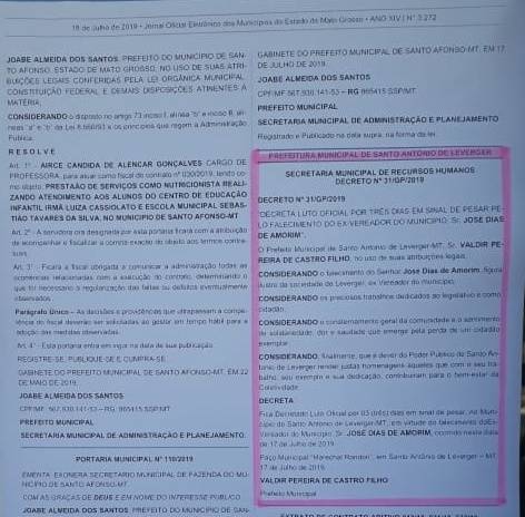 O Decreto foi publicado nesta quinta-feira (18), no Jornal Oficial da Associação dos Municípios de Mato Grosso – AMM. Bugre foi sepultado na manhã desta quinta-feira (18), ex-vereador de Santo Antônio, José Dias de Amorim (Seu Bugre), exerceu o cargo de vereador por seis mandatos, sendo eleito pela primeira vez em 1976.