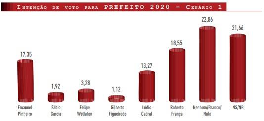Roberto França e Emanuel Pinheiro lideram a corrida pela prefeitura de Cuiabá para as eleições de 2020, num rigoroso empate técnico, com França ligeiramente à frente, com 18,55% das intenções de voto e Emanuel Pinheiro, com 17,35%.