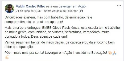 Nas redes sociais o prefeito comemorou a entrega da obra e postou o seguinte comentário: