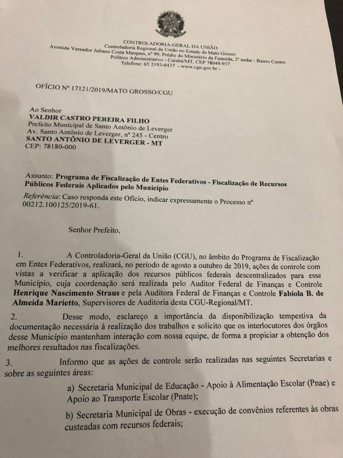 Trabalho da CGU com a Prefeitura de Leverger busca eficiência na prestação de serviços à população Buscando eficiência nas atividades desenvolvidas pela Prefeitura de Santo Antônio de Leverger, uma equipe da Controladoria Geral da União (CGU), está trabalhando no município de agosto a outubro de 2019.