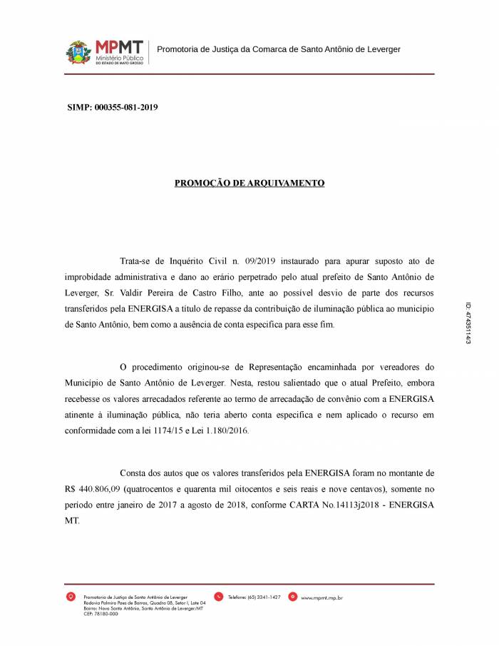 O arquivamento do processo foi realizado após uma denúncia de suposto ato de improbidade administrativa e dano ao erário, acusando a Prefeitura de desvios dos recursos da iluminação pública, transferido pela empresa de energia ENERGISA.