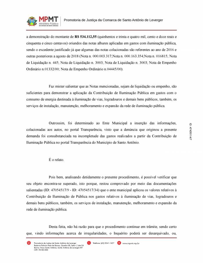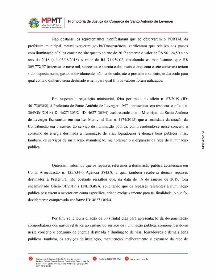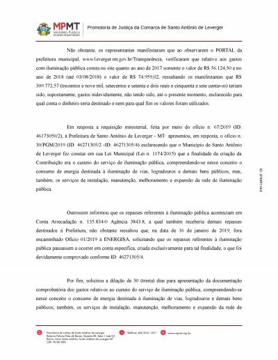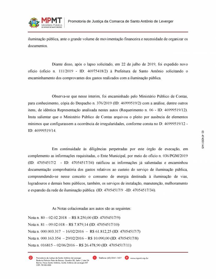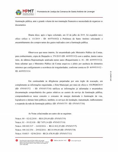 A Prefeitura de Leverger encaminhou ao Ministério Público via ofício, ratificando as informações comprovando gastos relativos ao custeio de serviços de iluminação pública de vias, logradouros e demais bens públicos, como também os serviços de instalação, manutenção, melhoramento e expansão da rede de iluminação pública, com o custo de R$ 534.112.
