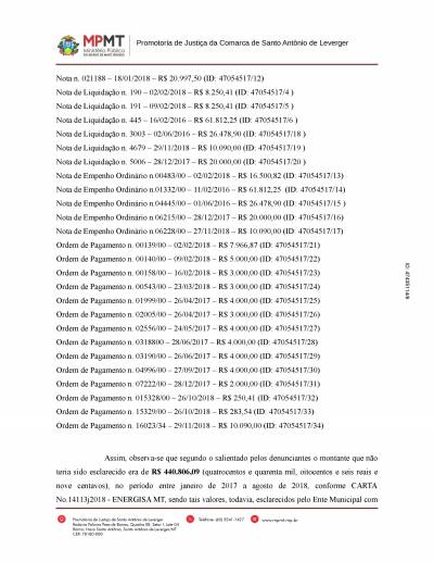 Na denúncia consta o valor transferido de R$ 440.806, de janeiro de 2017 a agosto de 2018, e que no portal transparência, www.leverger.mt.gov.br/transparencia, verificaram somente o valor de R$ 56.124 no ano de 2017 e R$ 74.959 de 2018, faltando R$ 309.772 que segundo os denunciantes teria sido supostamente gasto indevidamente.