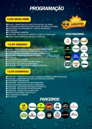 Já no domingo (15) a partir das 07hs da manhã irá acontecer um passeio ciclístico com saída do Parque Zezé Balduíno com destino à praia das Embaúbas. E durante o dia segue a programação do evento com destaque aos shows com a banda Erre Som e Gabriel Narcolan.