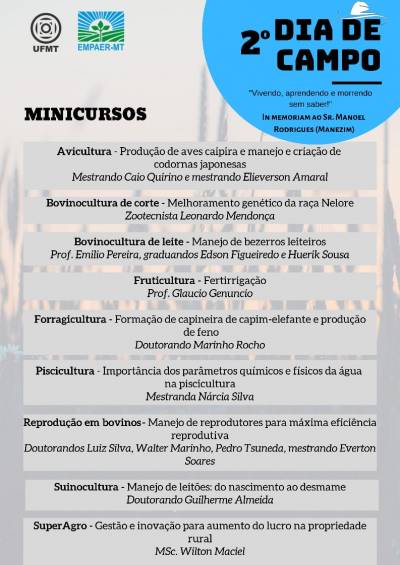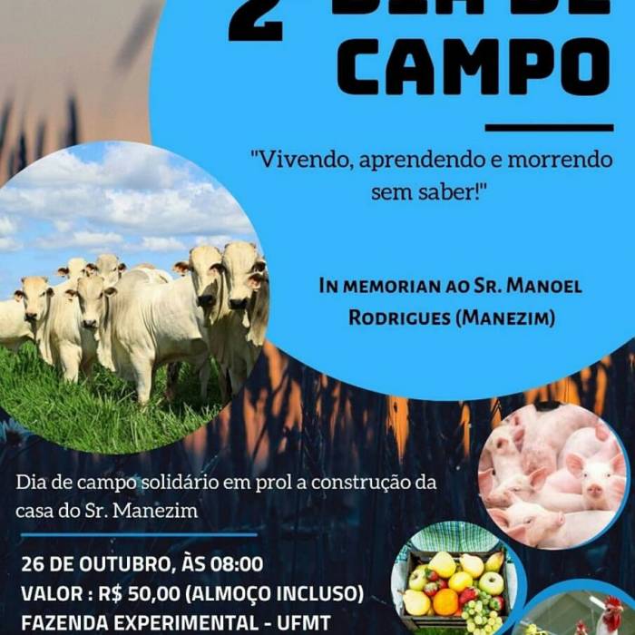 A comunidade acadêmica da Fazenda Experimental da Universidade Federal de Mato Grosso – UFMT, servidores, amigos e familiares do servidor, Manuelzinho Rodrigues (in memorian), promovem um Dia de Campo na sede da Fazenda com palestras, música ao vivo e um churrasco para angariar fundos para a construção de uma residência para viúva e seus filhos.