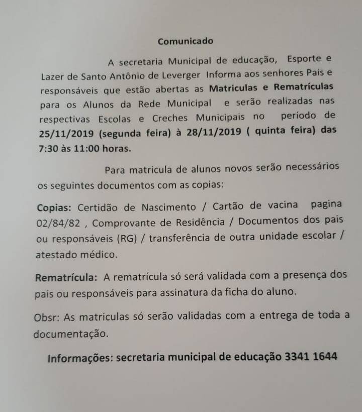 A Secretaria de Educação, Esporte e Lazer de Santo Antônio de Leverger, publicou as datas das novas matriculas e rematrículas, para os alunos da rede municipal, que serão realizadas nas respectivas Escolas e Creches municipais, no período de 25.11.2019 à 28.11.2019.