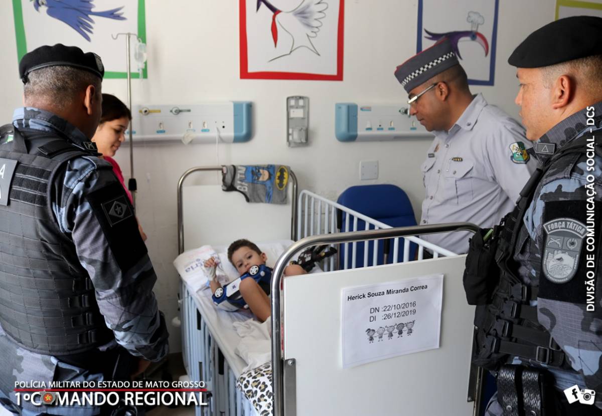 Na manhã desta segunda-feira (30.12) o Comandante Adjunto do 1° Comando Regional e Comandante da Força Tática, Ten Coronel PM Lara Filho, juntamente com o Subtenente PM Montezuma e o Sargento Júlio Nunes, realizaram uma visita solidária ao pequeno Herick que está internado no antigo Pronto Socorro Municipal de Cuiabá se recuperando de uma cirurgia na apendicite.