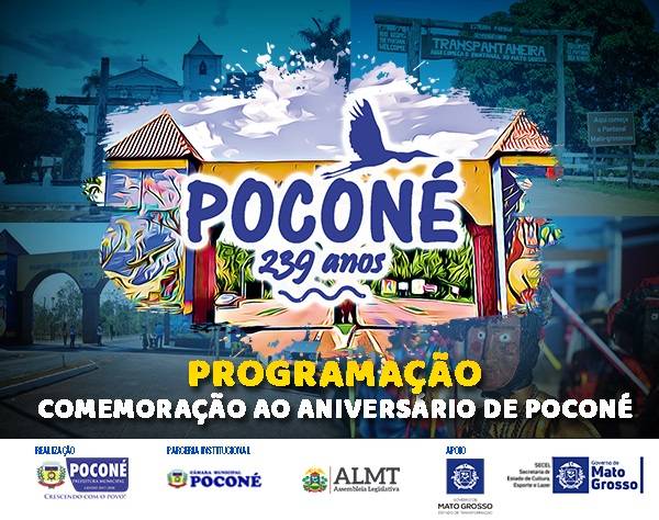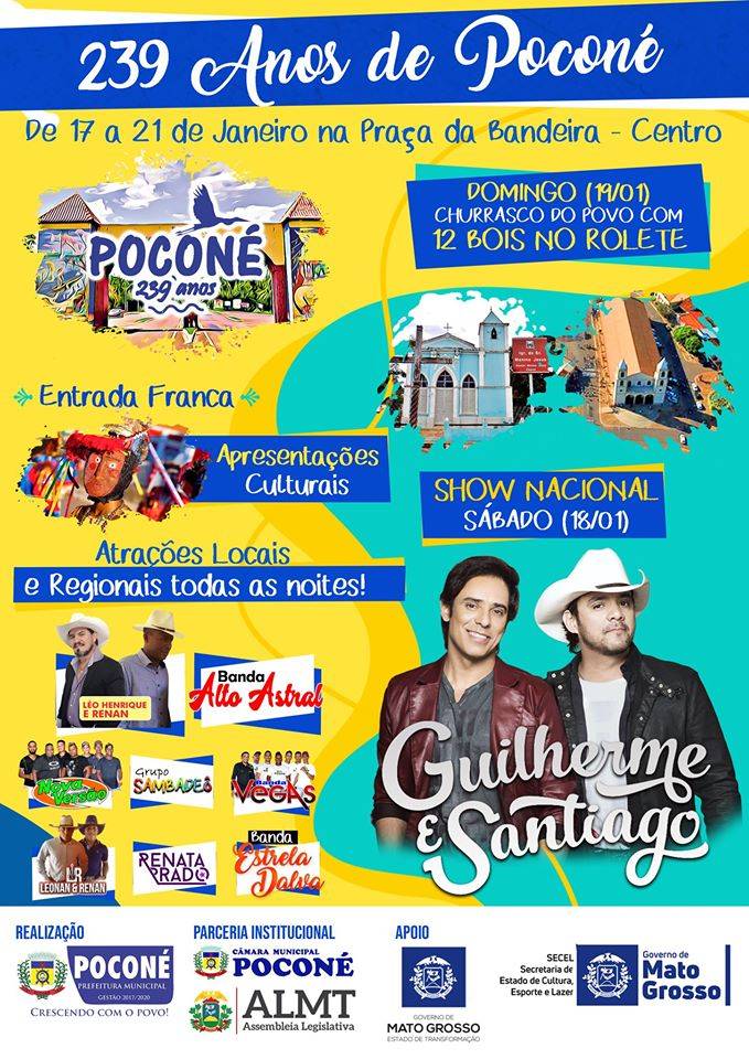 Cinco dias de festas para o Poconeano comemorar as melhorias e o visitante e turista conhecer Poconé, “além do pantanal” e no dia 18 de janeiro (sábado), Show Nacional com Dupla Guilherme e Santiago.