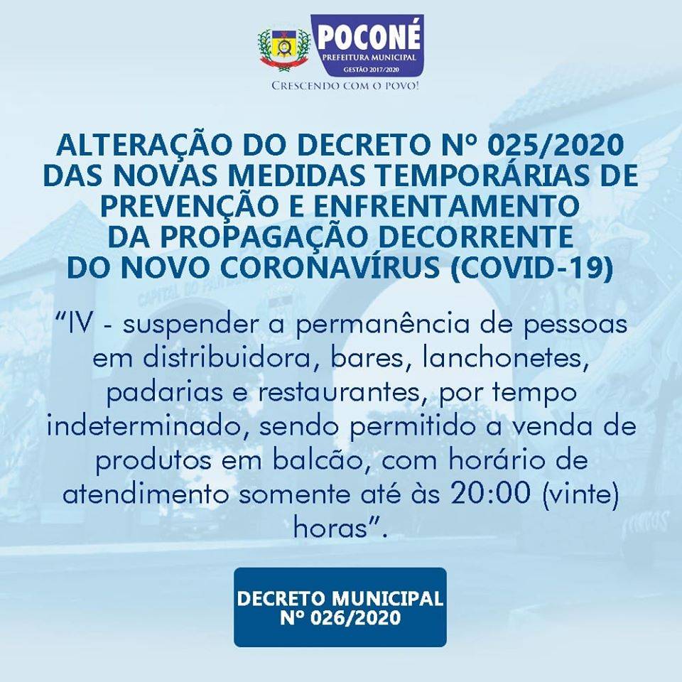 O Prefeito Tatá Amaral (DEM), neste sábado (21/03) altera o Decreto Nº 025/2020 que visa novas medidas temporárias de prevenção e enfrentamento da propagação decorrente do novo coronavírus (COVID-19) e determina a suspenção da permanência de pessoas em distribuidora, bares, lanchonetes, padarias e restaurantes, por tempo indeterminado, sendo permitido a venda de produtos em balcão, com horário de atendimento somente até às 20:00 (vinte) horas.