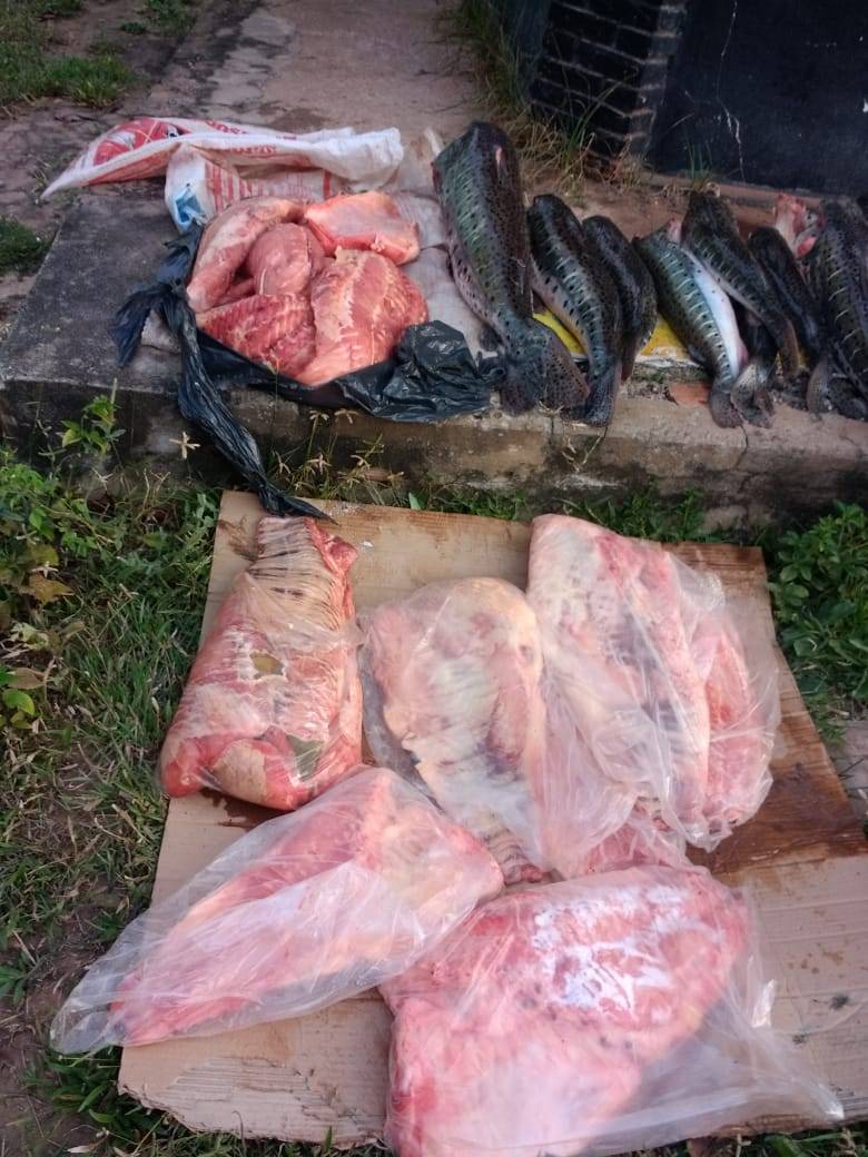Em monitoramento, ele parou na frente de sua casa quando foi abordado e constatado que transportava uma carga de pescado sem documentação, sendo 28 peças de pintado sem cabeça e 14 bandas entre jaú e pintado.