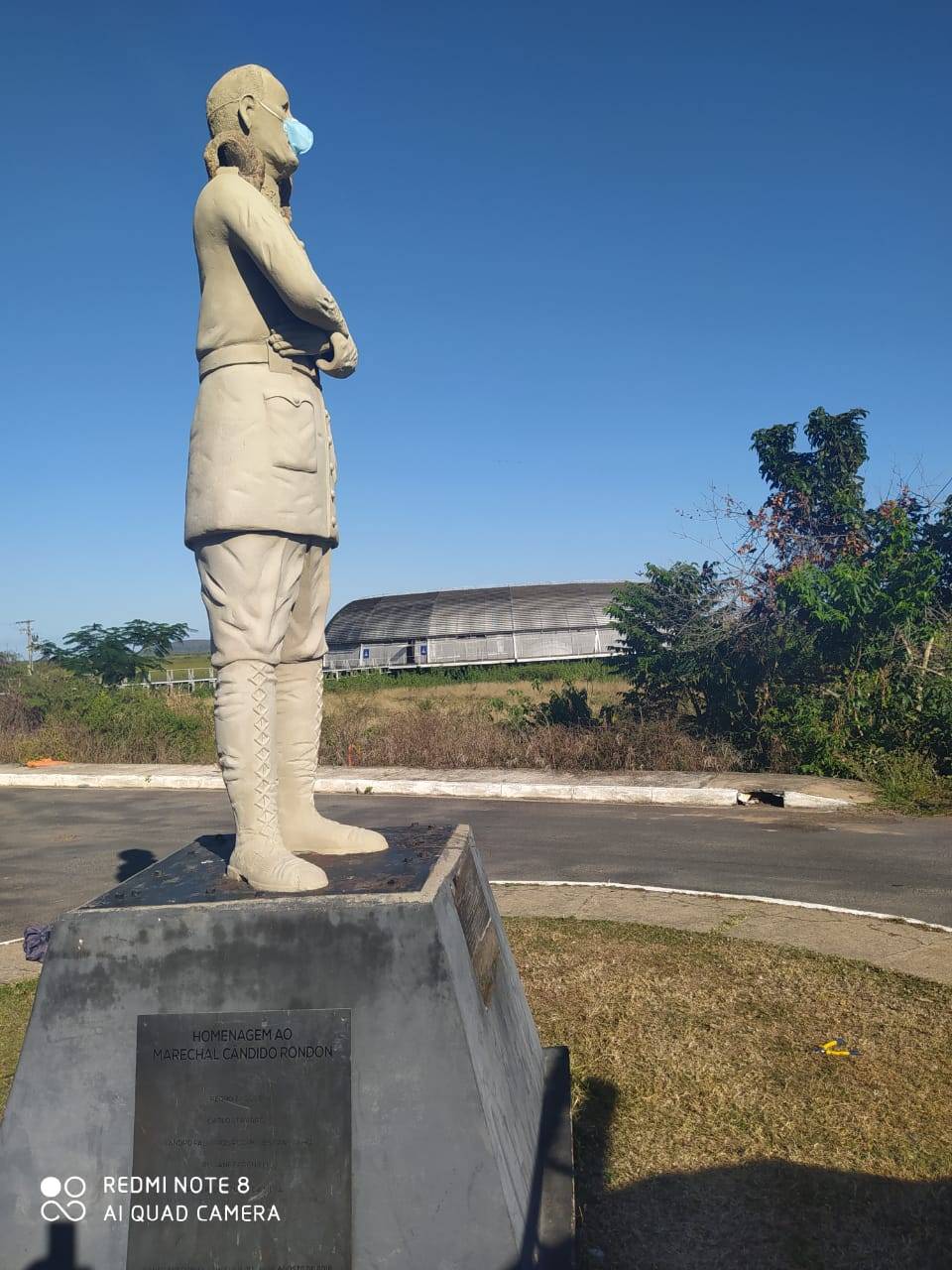 A estatua do Marechal Rondon, patrono das Comunicações do Brasil instalada em frente ao Memorial em Mimoso (72 km de Leverger), amanheceu nesta segunda-feira (11), com uma máscara em seu rosto.