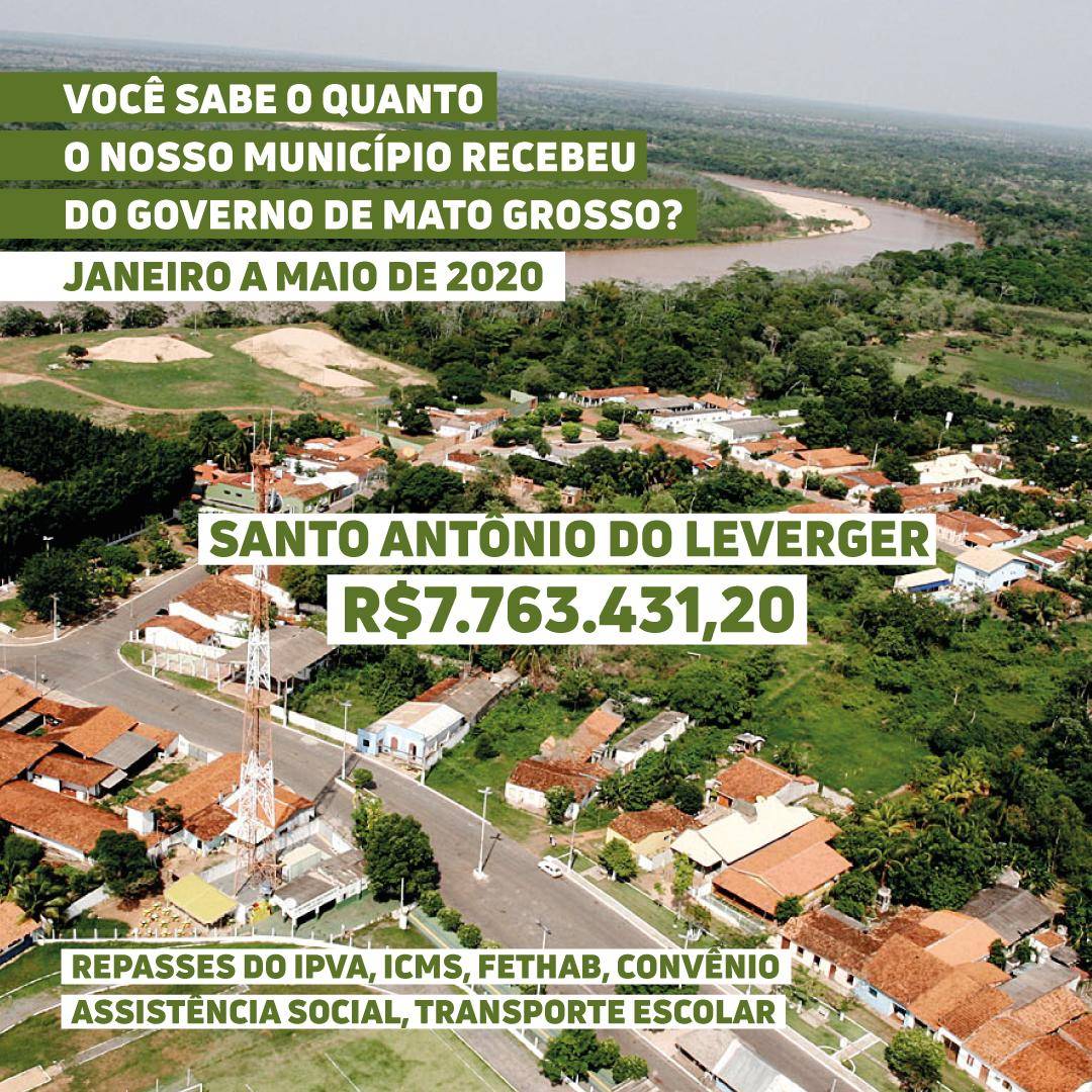 Segundo dados oficiais do governo, o prefeito de Santo Antônio de Leverger, Valdirzinho recebeu R$ 7,763. 431,20 (Sete milhões, setecentos e trinta e um mil reais e vinte centavos) de impostos que o cidadão pagou no período com o pagamento de IPVA, ICMS, FETHAB, transporte escolar e de convênios da Assistência Social do Estado que são transferidos para os municípios.