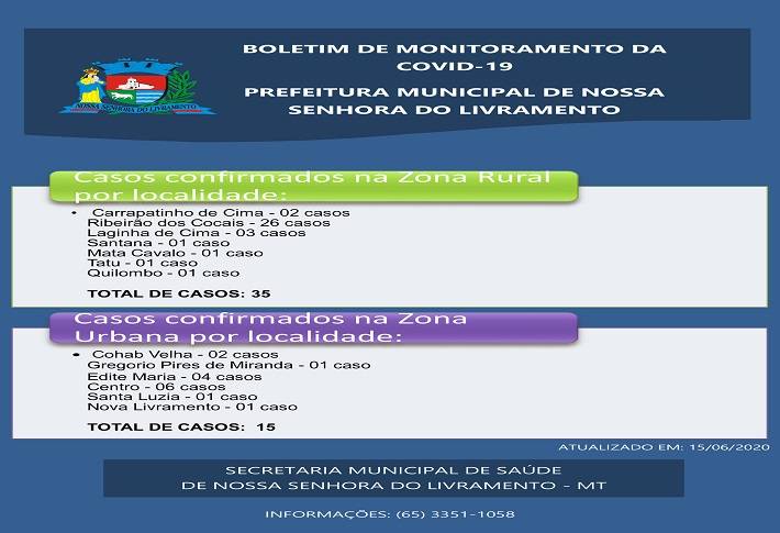 Na zona urbana são: 02 caso na Cohab Velha, 01 no Residencial Gregório Pires de Miranda, 04 casos no Edite Maria, 06 no Centro, 01 no Santa Luzia e 01 no bairro Nova Livramento. Total 15.
