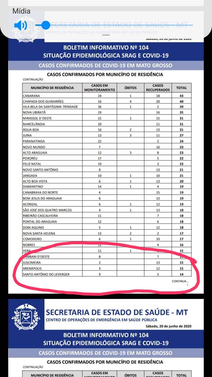 Dentre os 20 municípios com maior número de casos de Covid-19, estão Cuiabá (2.601), Rondonópolis (826), Várzea Grande (785), Primavera do Leste (404), Sorriso (403), Tangará da Serra (358), Lucas do Rio Verde (286), Confresa (273), Nova Mutum (259), Sinop (255), Campo Verde (214), Pontes e Lacerda (162), Barra do Garças (149), Cáceres (139), Alta Floresta (118), Campo Novo do Parecis (115), Querência (99), Nossa Senhora do Livramento (96), Jaciara (90) e Sapezal (88).