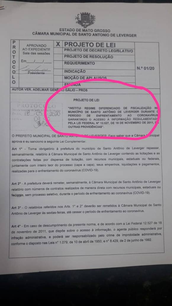 Segundo projeto, de autoria do vereador Adelmar Galio (PROS), Valdir estaria obrigado a fornecer todas as sextas-feiras as licitações, contratações feitas por dispensas de licitações com recursos municipais, estaduais e federais, além de empenhos, notas fiscais de pagamentos entre outros relacionados aos gastos do município para combater a pandemia.