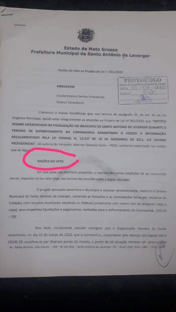 “Tal imposição à administração em enviar relatórios as sextas-feiras, até cessar o enfrentamento ao coronavírus (Covid-19) oneraria os cofres públicos de modo que fica defeso ao Poder Legislativo impor gastos ao Poder Executivo Municipal, e que pelos motivos expostos, tal obrigatoriedade acaba por ser desnecessária além de onerar os cofres municipais”, diz trecho extraído do veto.