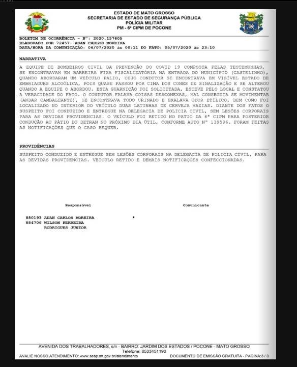 “Esta guarnição foi solicitada, esteve pelo local e constatou a veracidade do fato. O condutor falava coisas desconexas, mal conseguia se movimentar (andar cambaleante), se encontrava todo urinado e exalava odor etílico, bem como foi localizado no interior do veículo duas latinhas de cerveja vazias”, diz trecho do boletim de ocorrência.