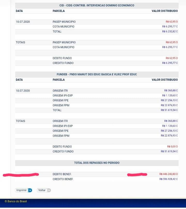 Clique na imagem para aumentar a visualização do extrato da conta da prefeitura com os lançamentos deste dia 10/07, e o bloqueio assinalado em vermelho.