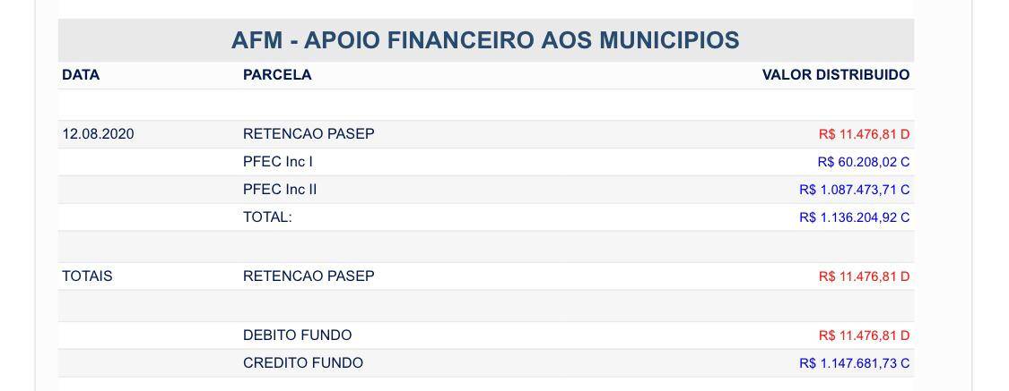 Este é o penúltimo repasse do auxílio, previsto para encerrar em setembro, considerando que foi aprovado o repasse de quatro parcelas. Em junho a prefeitura de Leverger recebeu o valor de R$ 1.136.204,92. Bem como em julho, com o repasse de R$ 1.136.204,92.