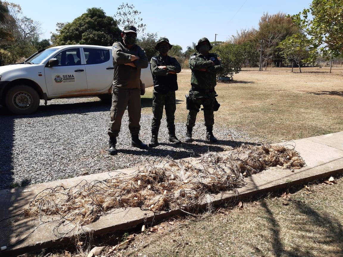 Policiais militares do Batalhão Ambiental e agentes da Secretaria de Estado de Meio Ambiente (Sema) apreenderam nesta quarta-feira (19.08), uma rede de pesca predatória de 1,2 mil metros, em Santo Antônio do Leverger (a 34 km de Cuiabá).