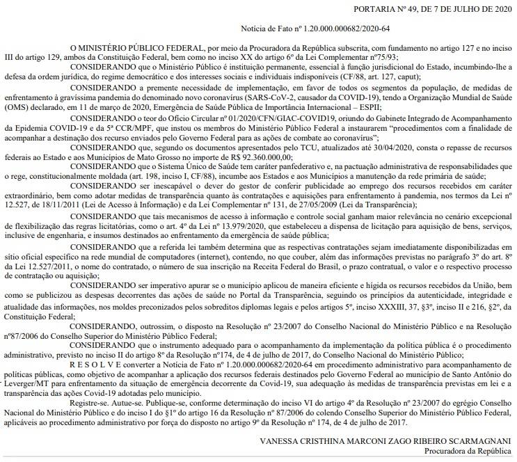 PORTARIA Nº 49, DE 7 DE JULHO DE 2020 Notícia de Fato nº 1.20.000.000682/2020-64 O MINISTÉRIO PÚBLICO FEDERAL, por meio da Procuradora da República subscrita, com fundamento no artigo 127 e no inciso III do artigo 129, ambos da Constituição Federal, bem como no inciso XX do artigo 6º da Lei Complementar nº75/93; CONSIDERANDO que o Ministério Público é instituição permanente, essencial à função jurisdicional do Estado, incumbindo-lhe a defesa da ordem jurídica, do regime democrático e dos interesses sociais e individuais indisponíveis (CF/88, art. 127, caput); CONSIDERANDO a premente necessidade de implementação, em favor de todos os segmentos da população, de medidas de enfrentamento à gravíssima pandemia do denominado novo coronavírus (SARS-CoV-2, causador da COVID-19), tendo a Organização Mundial de Saúde (OMS) declarado, em 11 de março de 2020, Emergência de Saúde Pública de Importância Internacional – ESPII; CONSIDERANDO o teor do Ofício Circular nº 01/2020/CFN/GIAC-COVID19, oriundo do Gabinete Integrado de Acompanhamento da Epidemia COVID-19 e da 5ª CCR/MPF, que instou os membros do Ministério Público Federal a instaurarem “procedimentos com a finalidade de acompanhar a destinação dos recurso enviados pelo Governo Federal para as ações de combate ao coronavírus”; CONSIDERANDO que, segundo os documentos apresentados pelo TCU, atualizados até 30/04/2020, consta o repasse de recursos federais ao Estado e aos Municípios de Mato Grosso no importe de R$ 92.360.000,00; CONSIDERANDO que o Sistema Único de Saúde tem caráter panfederativo e, na pactuação administrativa de responsabilidades que o rege, constitucionalmente moldada (art. 198, inciso I, CF/88), incumbe aos Estados e aos Municípios a manutenção da rede primária de saúde; CONSIDERANDO ser inescapável o dever do gestor de conferir publicidade ao emprego dos recursos recebidos em caráter extraordinário, bem como adotar medidas de transparência quanto às contratações e aquisições para enfrentamento à pandemia, nos termos da Lei nº 12.527, de 18/11/2011 (Lei de Acesso à Informação) e da Lei Complementar nº 131, de 27/05/2009 (Lei da Transparência); CONSIDERANDO que tais mecanismos de acesso à informação e controle social ganham maior relevância no cenário excepcional de flexibilização das regras licitatórias, como o art. 4º da Lei nº 13.979/2020, que estabeleceu a dispensa de licitação para aquisição de bens, serviços, inclusive de engenharia, e insumos destinados ao enfrentamento da emergência de saúde pública; CONSIDERANDO que a referida lei também determina que as respectivas contratações sejam imediatamente disponibilizadas em sítio oficial específico na rede mundial de computadores (internet), contendo, no que couber, além das informações previstas no parágrafo 3º do art. 8º da Lei 12.527/2011, o nome do contratado, o número de sua inscrição na Receita Federal do Brasil, o prazo contratual, o valor e o respectivo processo de contratação ou aquisição; CONSIDERANDO ser imperativo apurar se o município aplicou de maneira eficiente e hígida os recursos recebidos da União, bem como se publicizou as despesas decorrentes das ações de saúde no Portal da Transparência, seguindo os princípios da autenticidade, integridade e atualidade das informações, nos moldes preconizados pelos sobreditos diplomas legais e pelos artigos 5º, inciso XXXIII, 37, §3º, inciso II e 216, §2º, da Constituição Federal; CONSIDERANDO, outrossim, o disposto na Resolução nº 23/2007 do Conselho Nacional do Ministério Público e na Resolução nº87/2006 do Conselho Superior do Ministério Público Federal; CONSIDERANDO que o instrumento adequado para o acompanhamento da implementação da política pública é o procedimento administrativo, previsto no inciso II do artigo 8º da Resolução nº174, de 4 de julho de 2017, do Conselho Nacional do Ministério Público; R E S O L V E converter a Notícia de Fato nº 1.20.000.000682/2020-64 em procedimento administrativo para acompanhamento de políticas públicas, como objetivo de acompanhar a aplicação dos recursos federais destinados pelo Governo Federal ao município de Santo Antônio do Leverger/MT para enfrentamento da situação de emergência decorrente da Covid-19, sua adequação às medidas de transparência previstas em lei e a transparência das ações Covid-19 adotadas pelo município. Registre-se. Autue-se. Publique-se, conforme determinação do inciso VI do artigo 4º da Resolução nº 23/2007 do egrégio Conselho Nacional do Ministério Público e do inciso I do §1º do artigo 16 da Resolução nº 87/2006 do colendo Conselho Superior do Ministério Público Federal, aplicáveis ao procedimento administrativo por força do disposto no artigo 9º da Resolução nº 174, de 4 de julho de 2017. VANESSA CRISTHINA MARCONI ZAGO RIBEIRO SCARMAGNANI Procuradora da República