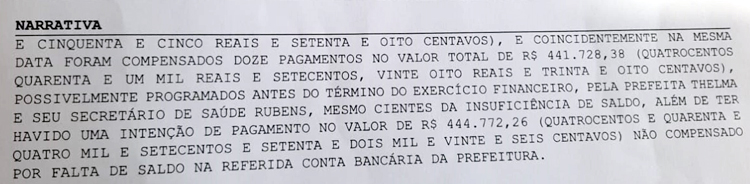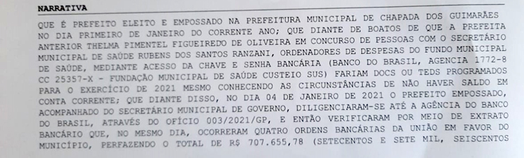 “Existe uma conta da Saúde que no dia 31 de dezembro tinha zero de fundo e no dia 4 foram feitas várias transferências da União. Conseguimos chegar a R$ 707 mil. E esses TEDs programados foram caindo em conta e consumiram R$ 441 mil. Quase meio milhão de reais”, relatou.