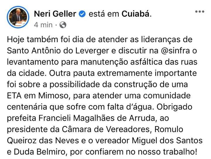 O primeiro encontro ocorreu no escritório político do deputado federal por Mato Grosso, Neri Geller (PP), durante a reunião as autoridades santo-antonienses receberam a boa notícia do parlamentar sobre a destinação de uma emenda de sua autoria para que o município receba R$ 2 milhões de reais que serão investidos na aquisição de material asfáltico que vai possibilitar a recuperação de ruas e avenidas de Leverger.