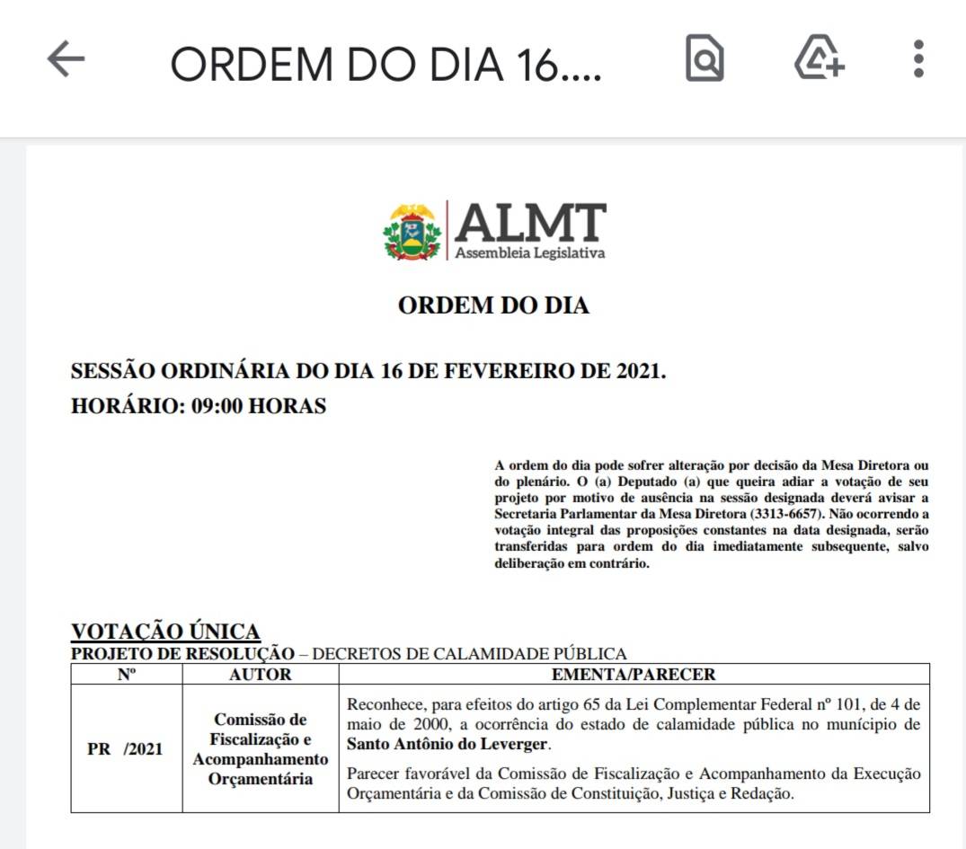 A Assembleia legislativa do estado de Mato Grosso aprovou na sessão ordinária desta terça-feira (16), um pedido de decretação de Estado de Calamidade Pública Financeira para a prefeitura de Santo Antônio de Leverger.