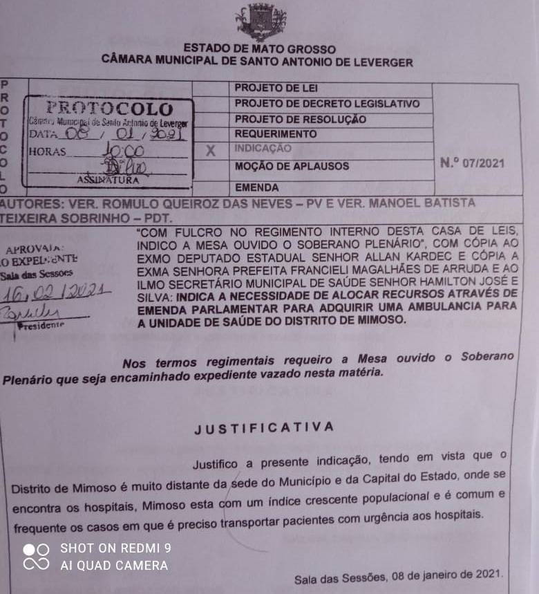 Em sua justificativa, o vereador destacou que o distrito de Mimoso é muito distante da sede do município, e também da capital, Cuiabá. Ressaltou também, que é comum e frequente os casos em que é preciso transportar pacientes com urgência até a sede ou para Cuiabá.