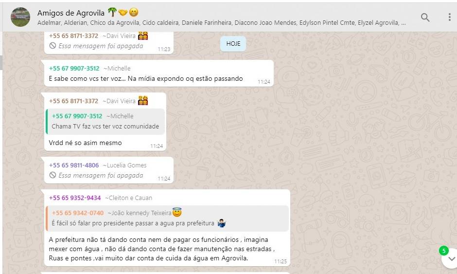 No meio da discussão, um morador e participante do grupo de whatsapp, cobrou da prefeita que estava “on line”, benfeitorias para as estradas e pontes da região, escreveu ainda que, “a prefeitura não dá conta nem do pagamento dos salários dos servidores municipais, imagina dá conta de cuida da água em Agrovila” .