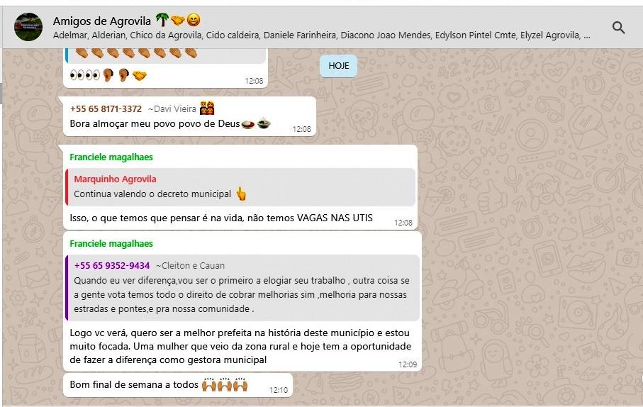 O corte no abastecimento de água aos moradores da comunidade de Agrovila das Palmeiras, município de Santo Antônio de Leverger, que estava programado para ocorrer a partir da próxima terça-feira (09), e aconteceu já neste sábado (06), fez dezenas moradores que participam de um grupo de whatsapp denominado de “Amigos de Agrovila”, cobrarem um posicionamento dos vereadores que foram eleitos pela região, o que fez a prefeita, Franciele Magalhães (PTB), que também é membro do grupo, participar da discussão.