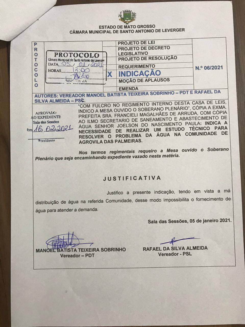 Rafael Silva, postou uma copia de uma indicação de sua autoria e do colega Manoel Teixeira, onde pede a prefeita a realização de um estudo técnico para solucionar a falta de água na comunidade.