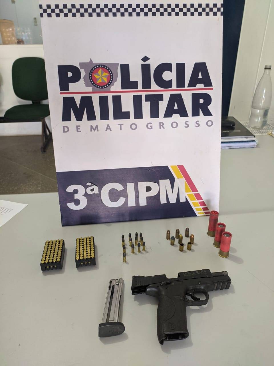 Uma barreira da Polícia Militar montada no trevo de Santo Antônio, entre as rodovias MT-040 e Imigrantes, deteve um motorista que trafegava com uma caminhonete Fiat/Toro, de cor branca, placa RAK-7c03. Durante a abordagem e revista no interior do veículo, os policiais da 3ª CIPM de Santo Antônio com apoio de viaturas do Batalhão de Trânsito Urbano e Rodoviário da PMMT- BPMTRAN, foi encontrado embaixo do banco do motorista 01 (uma) pistola de marca smith e wesson de numeração hhj9986, que estava alimentada e municiada, contendo em seu carregador 10 munições calibre 22 intactas.