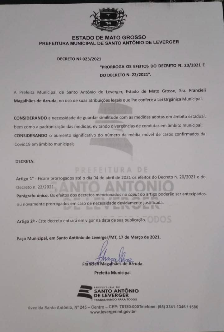 Segundo texto do novo decreto nº 023/2021, o aumento dos casos positivados no município e seguindo o novo decreto do Governo do Estado de Mato Grosso, fica prorrogado até o dia 04 de abril, as medidas de restrições que ainda estão em vigor pelo Decreto Municipal nº 020 e 22/2021.